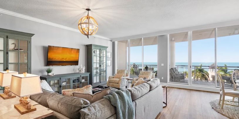 One of the most luxurious condo rentals available on Lido Key, a barrier island just off the coast of Sarasota. As you step off the private elevator into the foyer, you will be overwhelmed by the breathtaking views of the Gulf of Mexico through floor to ceiling glass windows. This 4 bedroom, 3.5 bathroom residence boasts Gulf to Bay views, solid wood doors, and sophisticated coastal décor throughout the main living area. Available for stays longer than 30 days.